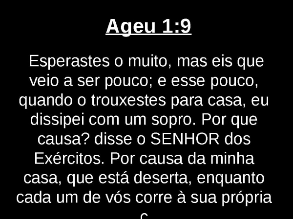 - Ageu 1:9 Esperastes o muito, mas eis que veio a ser pouco; e esse pouco, quando o trouxestes para casa, eu dissipei com um sopro. Por que causa? disse o SENHOR dos Exércitos. Por causa da minha casa, que está deserta, enquanto cada um de vós corre à sua própria c