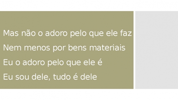- Mas não o adoro pelo que ele fazNem menos por bens materiaisEu o adoro pelo que ele éEu sou dele, tudo é dele