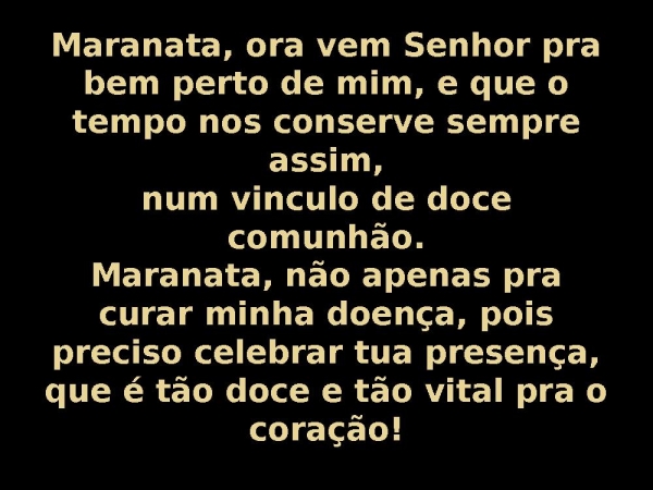 - Maranata, ora vem Senhor pra bem perto de mim, e que o tempo nos conserve sempre assim,num vinculo de doce comunhão.Maranata, não apenas pra curar minha doença, pois preciso celebrar tua presença, que é tão doce e tão vital pra o coração!