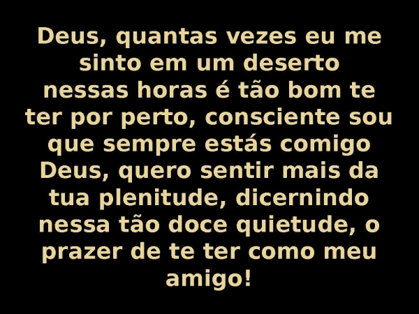 - Deus, quantas vezes eu me sinto em um desertonessas horas é tão bom te ter por perto, consciente sou que sempre estás comigoDeus, quero sentir mais da tua plenitude, dicernindo nessa tão doce quietude, o prazer de te ter como meu amigo!