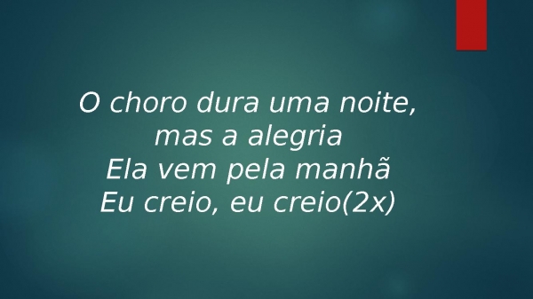 - O choro dura uma noite, mas a alegriaEla vem pela manhãEu creio, eu creio(2x)