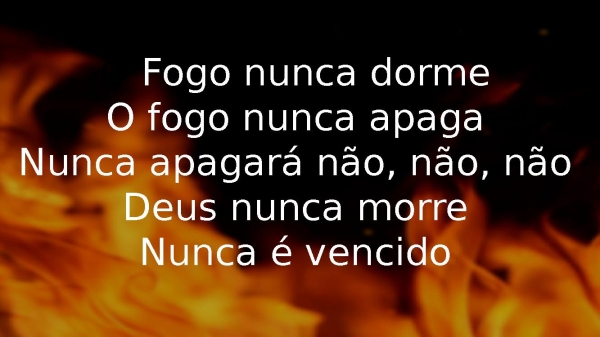 - O fogo nunca dormeO fogo nunca apagaNunca apagará não, não, nãoDeus nunca morreNunca é vencido