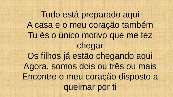 - Tudo está preparado aquiA casa e o meu coração tambémTu és o único motivo que me fez chegarOs filhos já estão chegando aquiAgora, somos dois ou três ou maisEncontre o meu coração disposto a queimar por ti