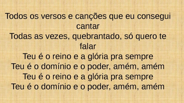 - Todos os versos e canções que eu consegui cantarTodas as vezes, quebrantado, só quero te falarTeu é o reino e a glória pra sempreTeu é o domínio e o poder, amém, amémTeu é o reino e a glória pra sempreTeu é o domínio e o poder, amém, amém