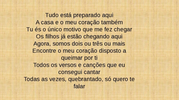- Tudo está preparado aquiA casa e o meu coração tambémTu és o único motivo que me fez chegarOs filhos já estão chegando aquiAgora, somos dois ou três ou maisEncontre o meu coração disposto a queimar por tiTodos os versos e canções que eu consegui cantarTodas as vezes, quebrantado, só quero te falar