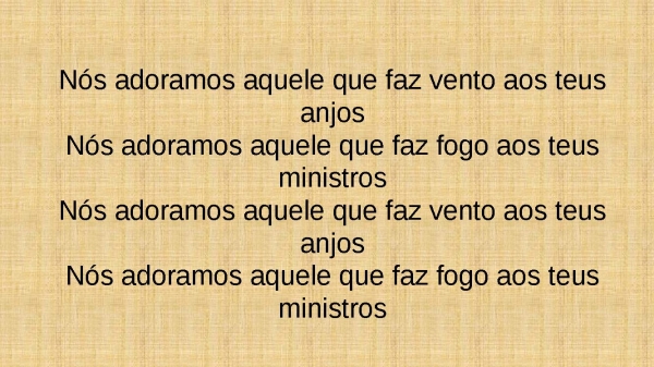 - Nós adoramos aquele que faz vento aos teus anjosNós adoramos aquele que faz fogo aos teus ministrosNós adoramos aquele que faz vento aos teus anjosNós adoramos aquele que faz fogo aos teus ministros