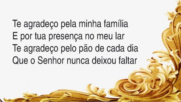 - Te agradeço pela minha famíliaE por tua presença no meu larTe agradeço pelo pão de cada diaQue o Senhor nunca deixou faltar