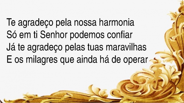 - Te agradeço pela nossa harmoniaSó em ti Senhor podemos confiarJá te agradeço pelas tuas maravilhasE os milagres que ainda há de operar