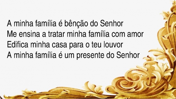 - A minha família é bênção do SenhorMe ensina a tratar minha família com amorEdifica minha casa para o teu louvorA minha família é um presente do Senhor