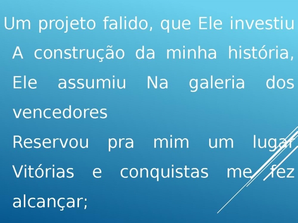 - Um projeto falido, que Ele investiu A construção da minha história, Ele assumiu Na galeria dos vencedoresReservou pra mim um lugarVitórias e conquistas me fez alcançar;
