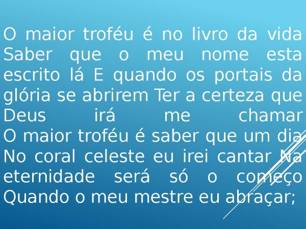 - O maior troféu é no livro da vidaSaber que o meu nome esta escrito lá E quando os portais da glória se abrirem Ter a certeza que Deus irá me chamarO maior troféu é saber que um dia No coral celeste eu irei cantar Na eternidade será só o começo Quando o meu mestre eu abraçar;
