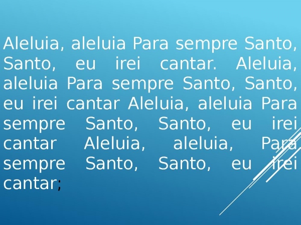 - Aleluia, aleluia Para sempre Santo, Santo, eu irei cantar. Aleluia, aleluia Para sempre Santo, Santo, eu irei cantar Aleluia, aleluia Para sempre Santo, Santo, eu irei cantar Aleluia, aleluia, Para sempre Santo, Santo, eu irei cantar;