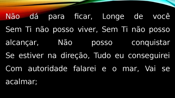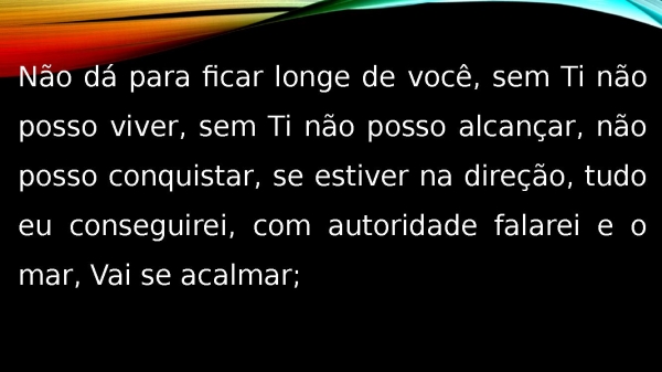 - Não dá para ficar, Longe de vocêSem Ti não posso viver, Sem Ti não posso alcançar, Não posso conquistarSe estiver na direção, Tudo eu conseguireiCom autoridade falarei e o mar, Vai se acalmar;
