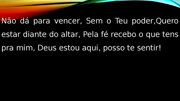 - Não dá para vencer, Sem o Teu poder,Quero estar diante do altar, Pela fé recebo o que tens pra mim, Deus estou aqui, posso te sentir!