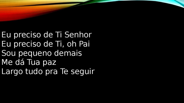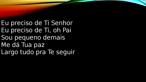 - Eu preciso de Ti SenhorEu preciso de Ti, oh PaiSou pequeno demaisMe dá Tua pazLargo tudo pra Te seguir