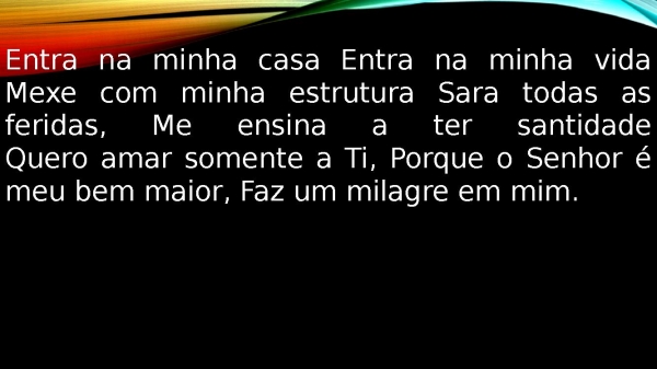- Entra na minha casa Entra na minha vidaMexe com minha estrutura Sara todas as feridas, Me ensina a ter santidadeQuero amar somente a Ti, Porque o Senhor é meu bem maior, Faz um milagre em mim.
