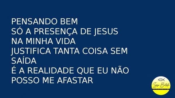 - Pensando bemSó a presença de Jesus na minha vidaJustifica tanta coisa sem saídaÉ a realidade que eu não posso me afastar