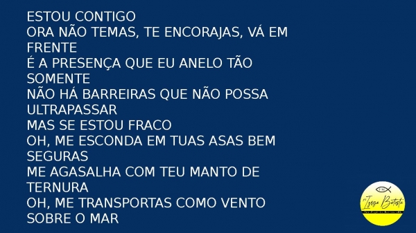 - Estou contigoOra não temas, te encorajas, vá em frenteÉ a presença que eu anelo tão somenteNão há barreiras que não possa ultrapassarMas se estou fracoOh, me esconda em tuas asas bem segurasMe agasalha com teu manto de ternuraOh, me transportas como vento sobre o mar