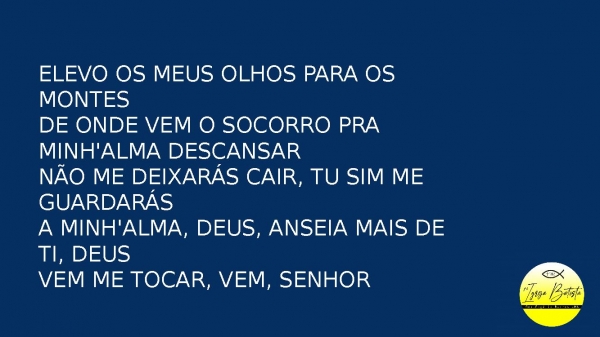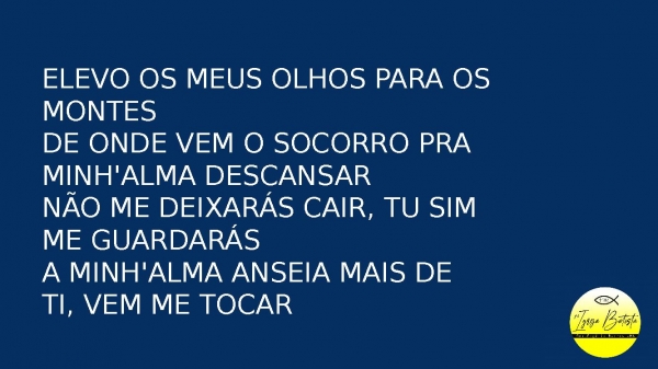 - Elevo os meus olhos para os montesDe onde vem o socorro pra minh'alma descansarNão me deixarás cair, Tu sim me guardarásA minh'alma anseia mais de Ti, vem me tocar