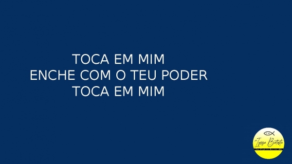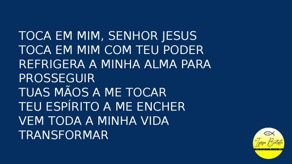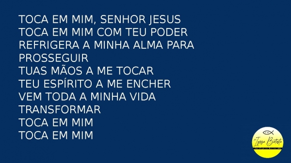 - Toca em mim, Senhor JesusToca em mim com teu poderRefrigera a minha alma para prosseguirTuas mãos a me tocarTeu espírito a me encherVem toda a minha vida transformarToca em mimToca em mim