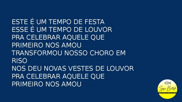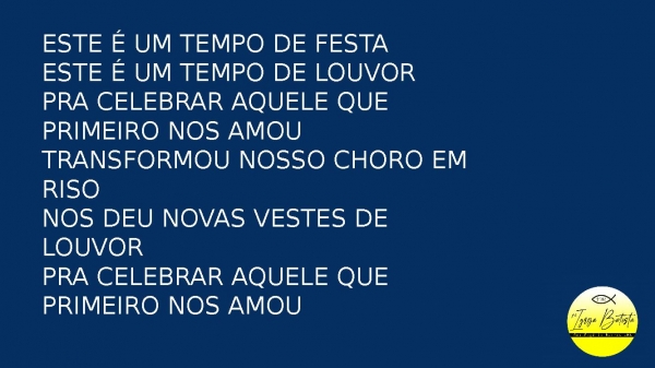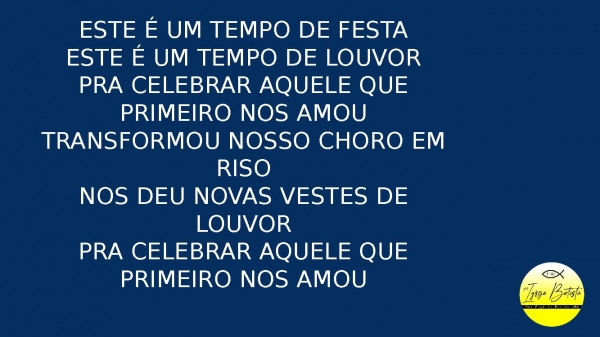 - Este é um tempo de festaEste é um tempo de louvorPra celebrar aquele que primeiro nos amouTransformou nosso choro em risoNos deu novas vestes de louvorPra celebrar aquele que primeiro nos amou