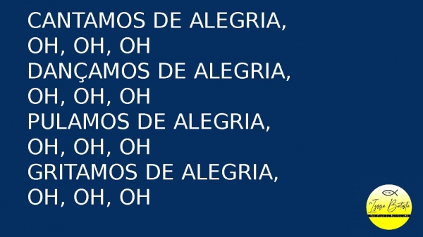 - Cantamos de alegria, oh, oh, ohDançamos de alegria, oh, oh, ohPulamos de alegria, oh, oh, ohGritamos de alegria, oh, oh, oh