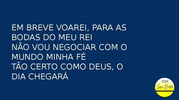 - Em breve voarei, para as bodas do meu ReiNão vou negociar com o mundo minha féTão certo como Deus, o dia chegará