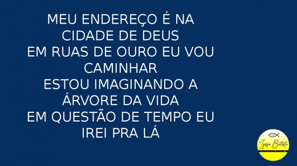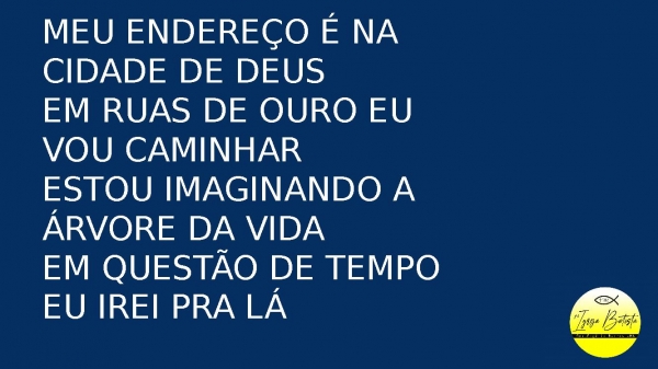 - Meu endereço é na cidade de DeusEm ruas de ouro eu vou caminharEstou imaginando a árvore da vidaEm questão de tempo eu irei pra lá