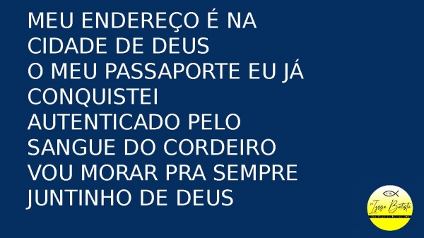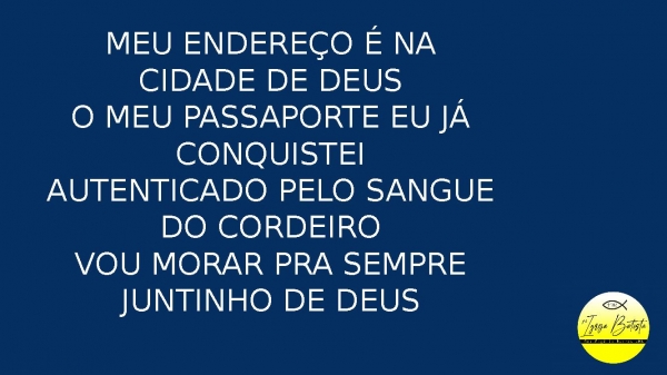 - Meu endereço é na cidade de DeusO meu passaporte eu já conquisteiAutenticado pelo sangue do CordeiroVou morar pra sempre juntinho de Deus