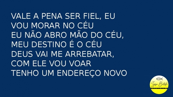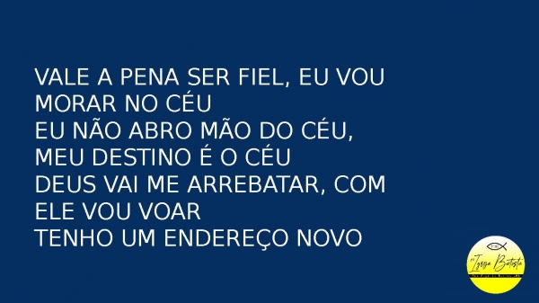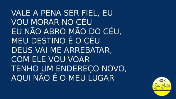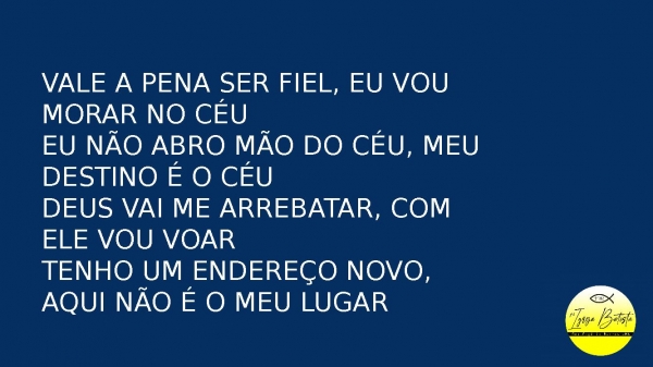 - Vale a pena ser fiel, eu vou morar no céuEu não abro mão do céu, meu destino é o céuDeus vai me arrebatar, com Ele vou voarTenho um endereço novo, aqui não é o meu lugar