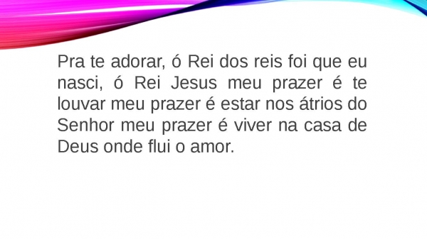 - Pra te adorar, ó Rei dos reis foi que eu nasci, ó Rei Jesus meu prazer é te louvar meu prazer é estar nos átrios do Senhor meu prazer é viver na casa de Deus onde flui o amor.