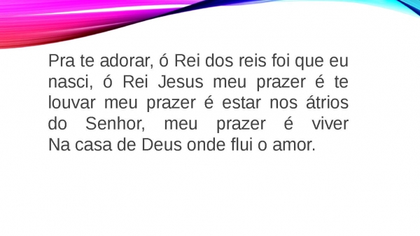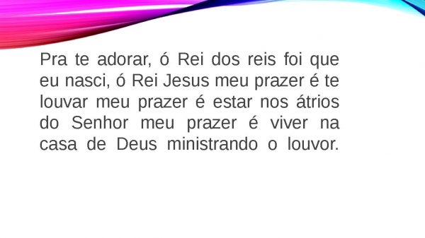 - Pra te adorar, ó Rei dos reis foi que eu nasci, ó Rei Jesus meu prazer é te louvar meu prazer é estar nos átrios do Senhor, meu prazer é viverNa casa de Deus onde flui o amor.