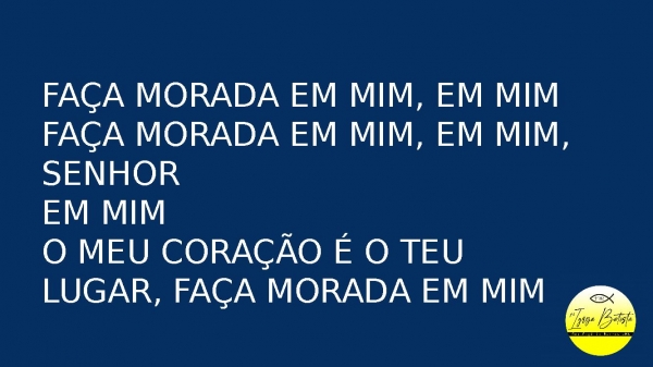 - Faça morada em mim, em mimFaça morada em mim, em mim, SenhorEm mimO meu coração é o Teu lugar, faça morada em mim