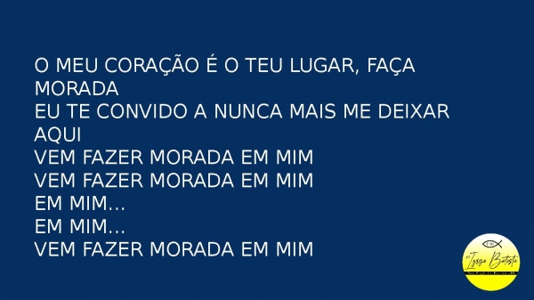 - O meu coração é o Teu lugar, faça moradaEu Te convido a nunca mais me deixar aquiVem fazer morada em mimVem fazer morada em mimEm mim...Em mim...Vem fazer morada em mim