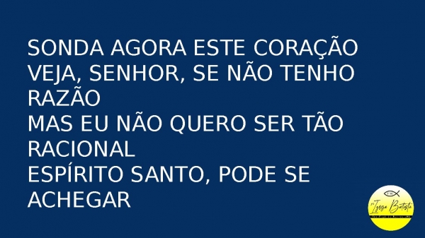 - Sonda agora este coraçãoVeja, Senhor, se não tenho razãoMas eu não quero ser tão racionalEspírito Santo, pode se achegar