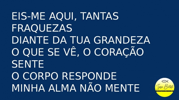 - Eis-me aqui, tantas fraquezasDiante da Tua grandezaO que se vê, o coração senteO corpo respondeMinha alma não mente