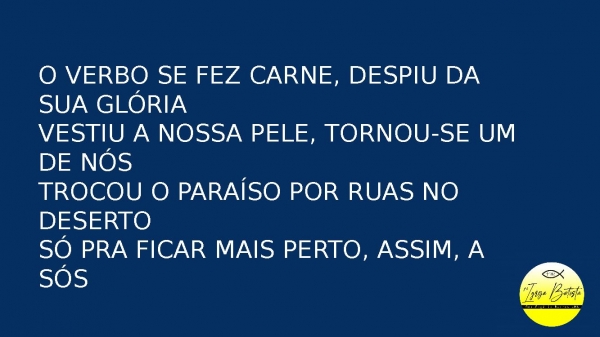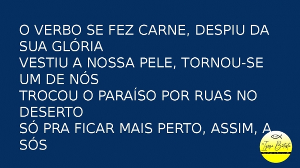 - O Verbo se fez carne, despiu da Sua glóriaVestiu a nossa pele, tornou-se um de nósTrocou o Paraíso por ruas no desertoSó pra ficar mais perto, assim, a sós