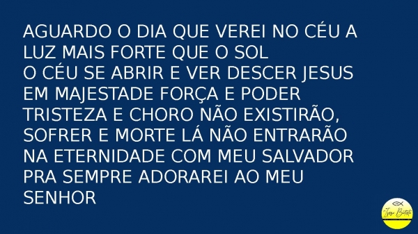 - Aguardo o dia que verei no céu a luz mais forte que o SolO céu se abrir e ver descer Jesus em majestade força e poderTristeza e choro não existirão, sofrer e morte lá não entrarãoNa eternidade com meu salvador pra sempre adorarei ao meu Senhor
