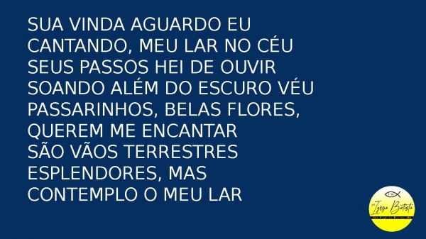 - Sua vinda aguardo eu cantando, meu lar no céuSeus passos hei de ouvir soando além do escuro véuPassarinhos, belas flores, querem me encantarSão vãos terrestres esplendores, mas contemplo o meu lar