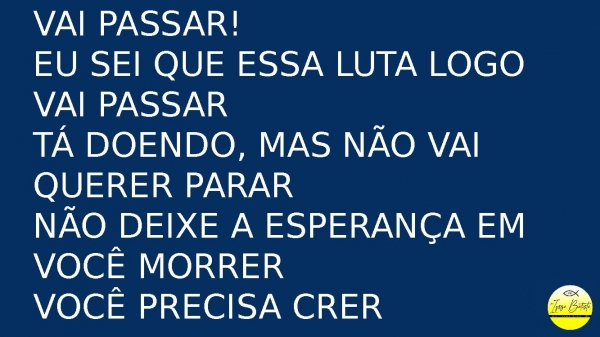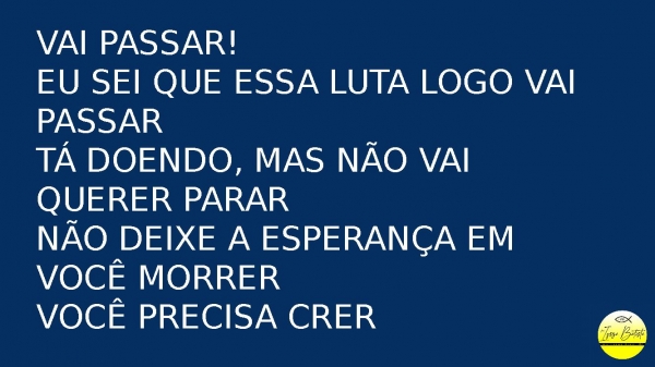 - Vai passar!Eu sei que essa luta logo vai passarTá doendo, mas não vai querer pararNão deixe a esperança em você morrerVocê precisa crer