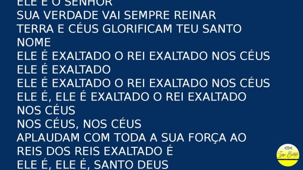 - Ele é o SenhorSua verdade vai sempre reinarTerra e céus glorificam Teu santo nomeEle é exaltado o rei exaltado nos céusEle é exaltadoEle é exaltado o rei exaltado nos céusEle é, Ele é exaltado o rei exaltado nos céusNos céus, nos céusAplaudam com toda a sua força ao Reis dos Reis exaltado éEle é, Ele é, Santo Deus