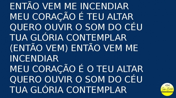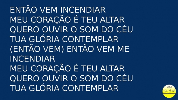 - Então vem me incendiarMeu coração é teu altarQuero ouvir o som do céuTua glória contemplar(Então vem) então vem me incendiarMeu coração é o teu altarQuero ouvir o som do céuTua glória contemplar
