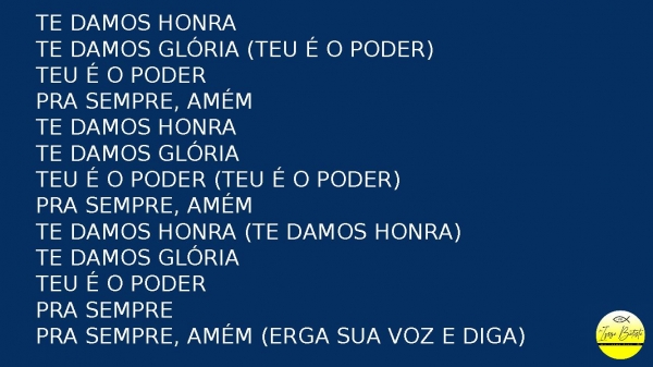- Te damos honraTe damos glória (Teu é o poder)Teu é o poderPra sempre, amémTe damos honraTe damos glóriaTeu é o poder (Teu é o poder)Pra sempre, amémTe damos honra (Te damos honra)Te damos glóriaTeu é o poderPra semprePra sempre, amém (erga sua voz e diga)
