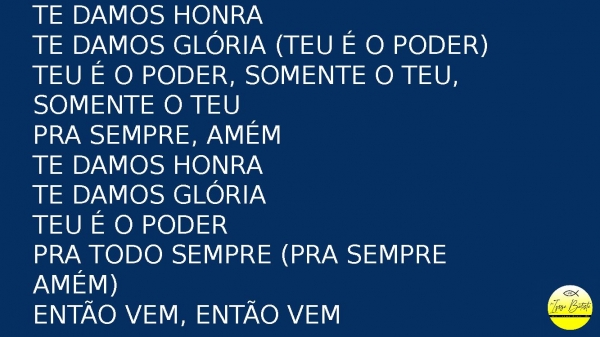 - te damos honraTe damos glória (Teu é o poder)Teu é o poder, somente o teu, somente o teuPra sempre, amémTe damos honraTe damos glóriaTeu é o poderPra todo sempre (pra sempre amém)Então vem, então vem