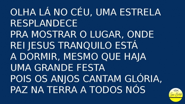 - Olha lá no céu, uma estrela resplandecePra mostrar o lugar, onde Rei Jesus tranquilo estáA dormir, mesmo que haja uma grande festaPois os anjos cantam glória, paz na terra a todos nós