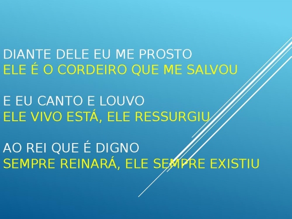 - Diante dele eu me prosto Ele é o cordeiro que me salvou e eu canto e louvo Ele vivo está, ele ressurgiu Ao Rei que é digno Sempre reinará, ele sempre existiu