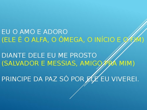 - Eu o amo e adoro (Ele é o Alfa, o Ômega, o início e o fim) Diante dele eu me prosto(Salvador e Messias, amigo pra mim) Principe da paz só por ele eu viverei.