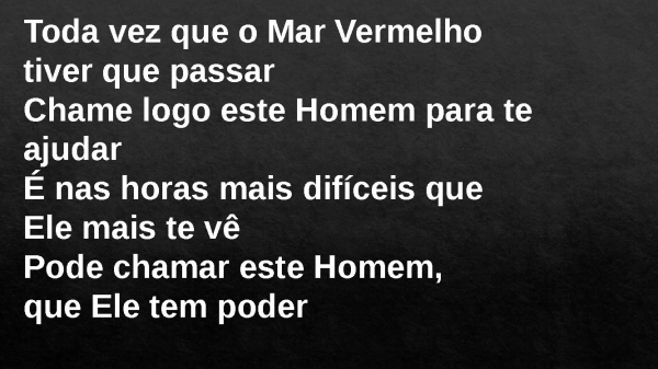 - Toda vez que o Mar Vermelho tiver que passarChame logo este Homem para te ajudarÉ nas horas mais difíceis que Ele mais te vêPode chamar este Homem, que Ele tem poder