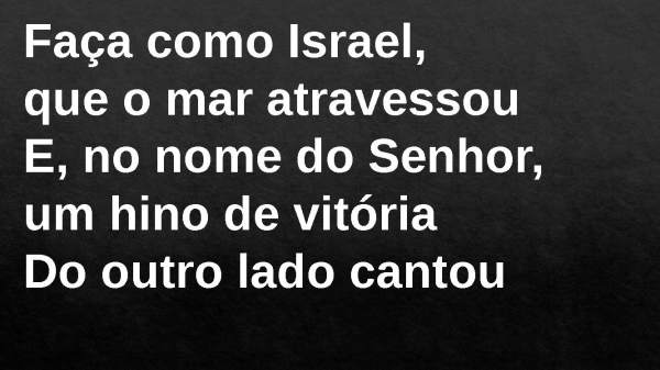 - Faça como Israel, que o mar atravessouE, no nome do Senhor, um hino de vitóriaDo outro lado cantou