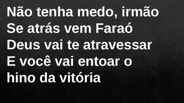 - Não tenha medo, irmãoSe atrás vem FaraóDeus vai te atravessarE você vai entoar o hino da vitória